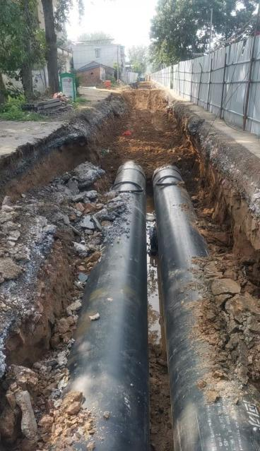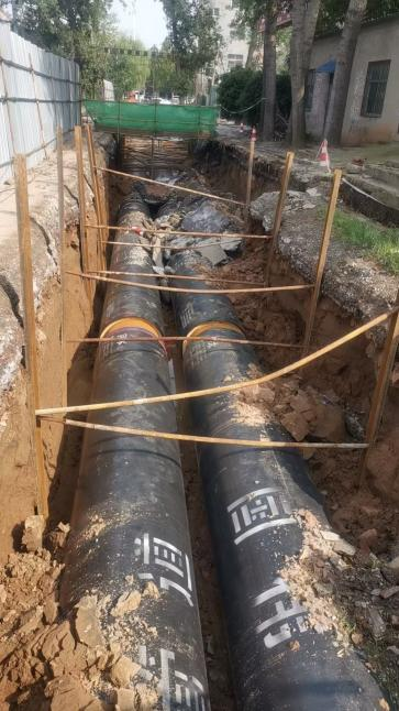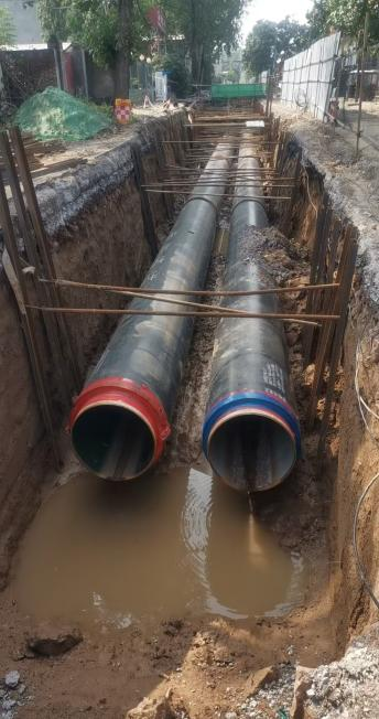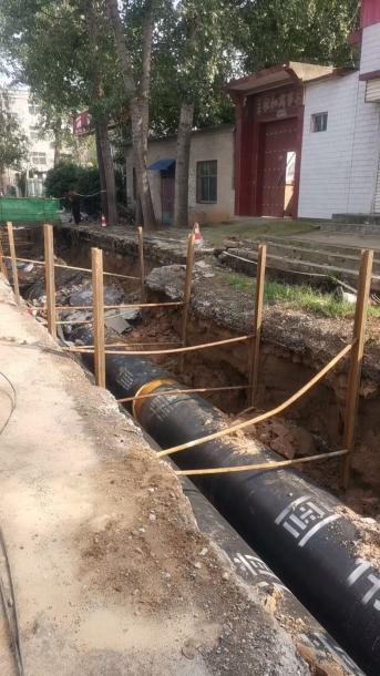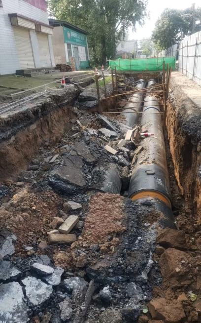 管基未夯实且未铺设规定的中粗砂弧基,管道缺乏中粗砂包裹回填与分层振夯;施工间歇乃至雨天,管道及保温层均未封堵;需钢膜支护路段进行简单支护导致路基塌陷、路面开裂。这些违规操作不仅使管网面临极大泄漏乃至爆管伤人风险,更折射出工程监管环节的严重失守。